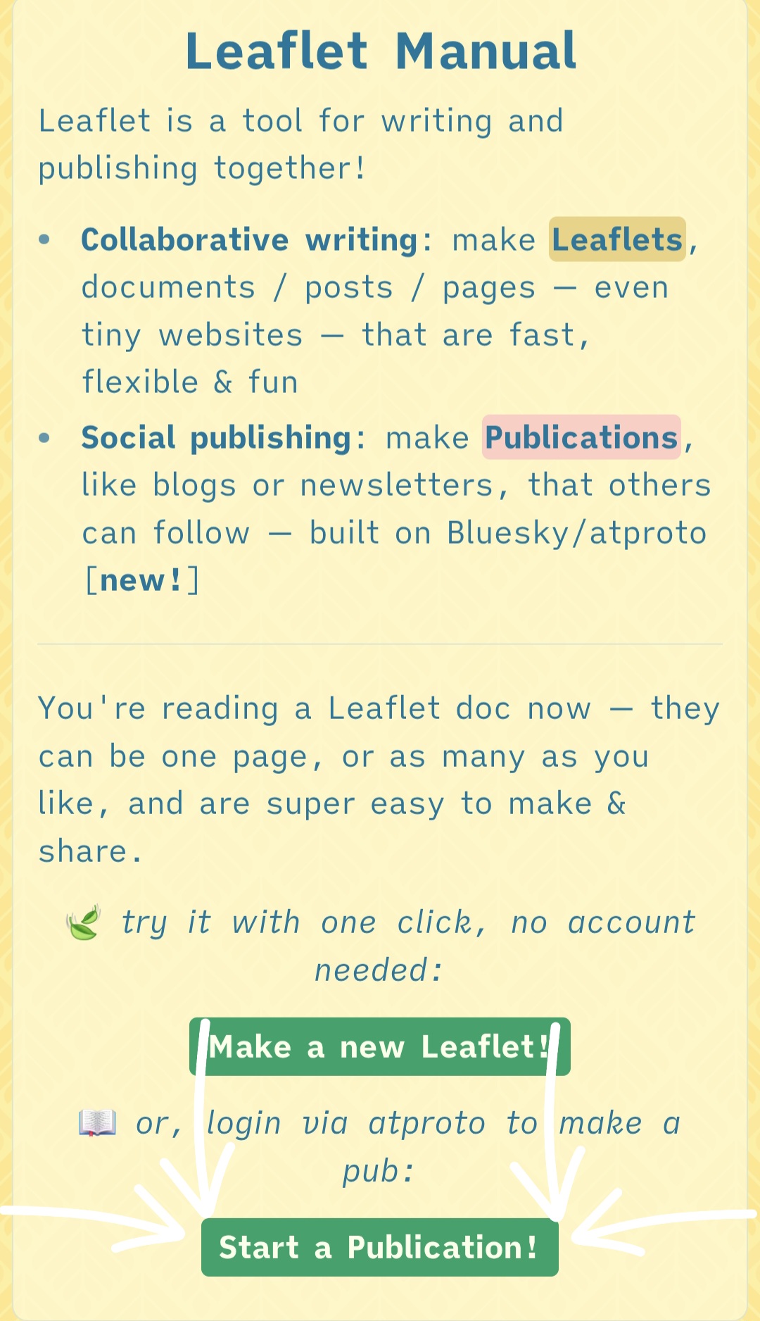 If you haven't already, the very first thing you're going to want to do is make a Leaflet publication. This is where you're going to publish your erotic stories or link out to your erotica elsewhere. The process is incredibly simple - just sign in with your BlueSky account!
