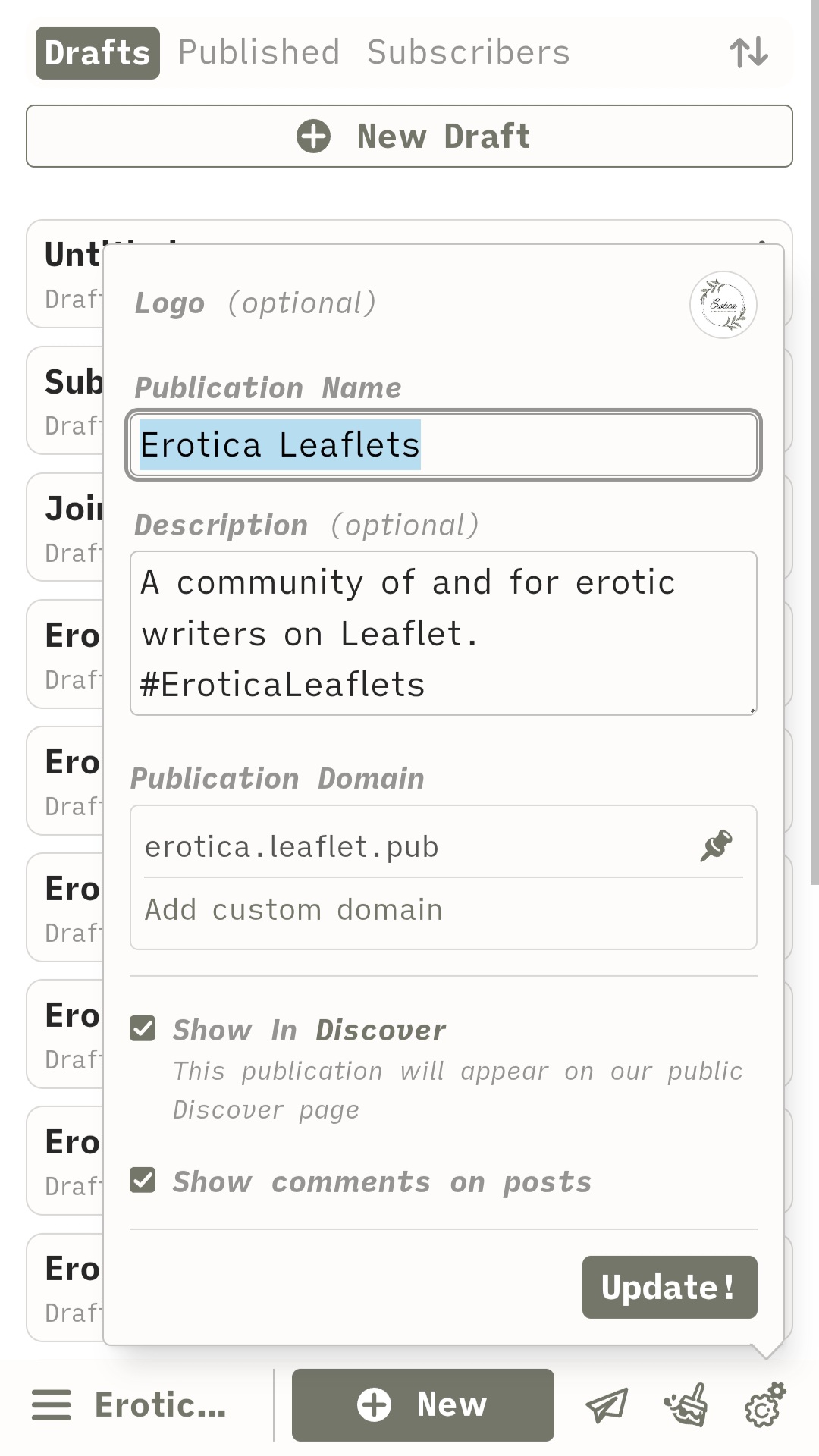 Name your publication, add a logo, write a description, pick a domain (you can even use a custom domain, if you'd like) and decide whether you want to show up in the Leaflet discover feed or allow comments.