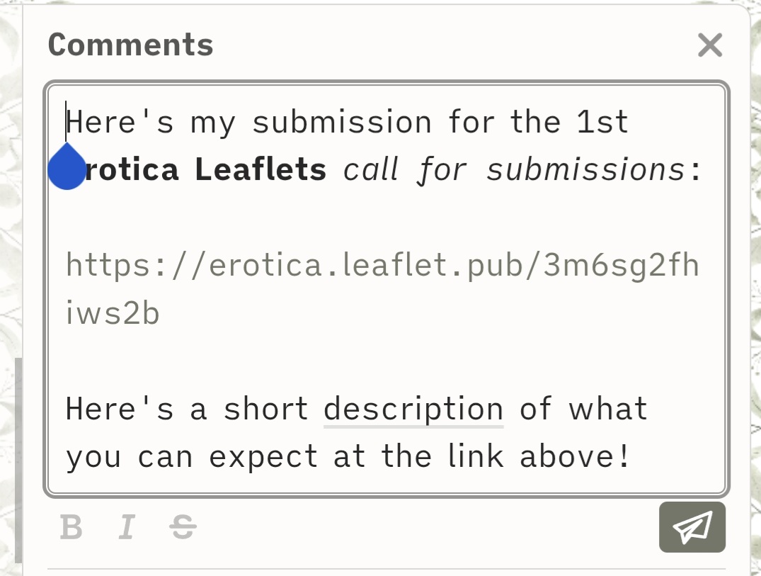 Everything you need to know about joining and participating in the Erotica Leaflets community, including FAQs and important links, can be found in our welcome post: